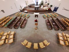 Eine leicht ovale Sitzordnung, der neue Altar steht auf der unteren Ebene in der Mitte, der bewegliche Ambo im großen Abstand gegenüber. Zwischen Altar und Ambo steht die Osterkerze. Die Sitzmöglichkeiten sind links und rechts der Achse Altar/Ambo in leichtem Oval angeordnet, wobei die Bänke die Mitte bilden. Die Stühle stehen links und rechts der Bänke, auf beiden Seiten der gedachten Achse.