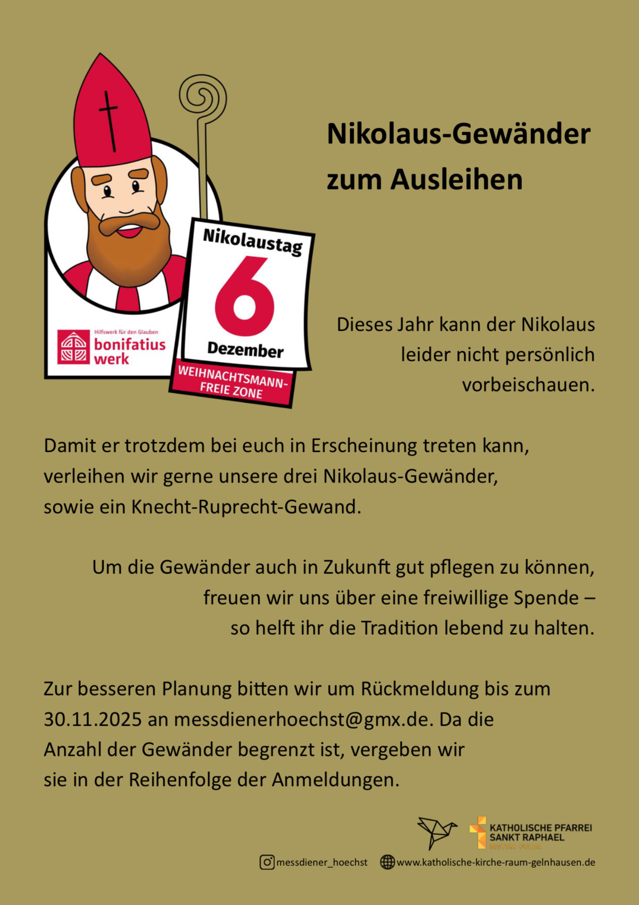 Dieses Jahr kann der Nikolaus leider nicht persönlich vorbeischauen. Damit er trotzdem bei euch in Erscheinung treten kann, verleihen wir gerne unsere drei Nikolaus-Gewänder, sowie ein Knecht-Ruprecht-Gewand.