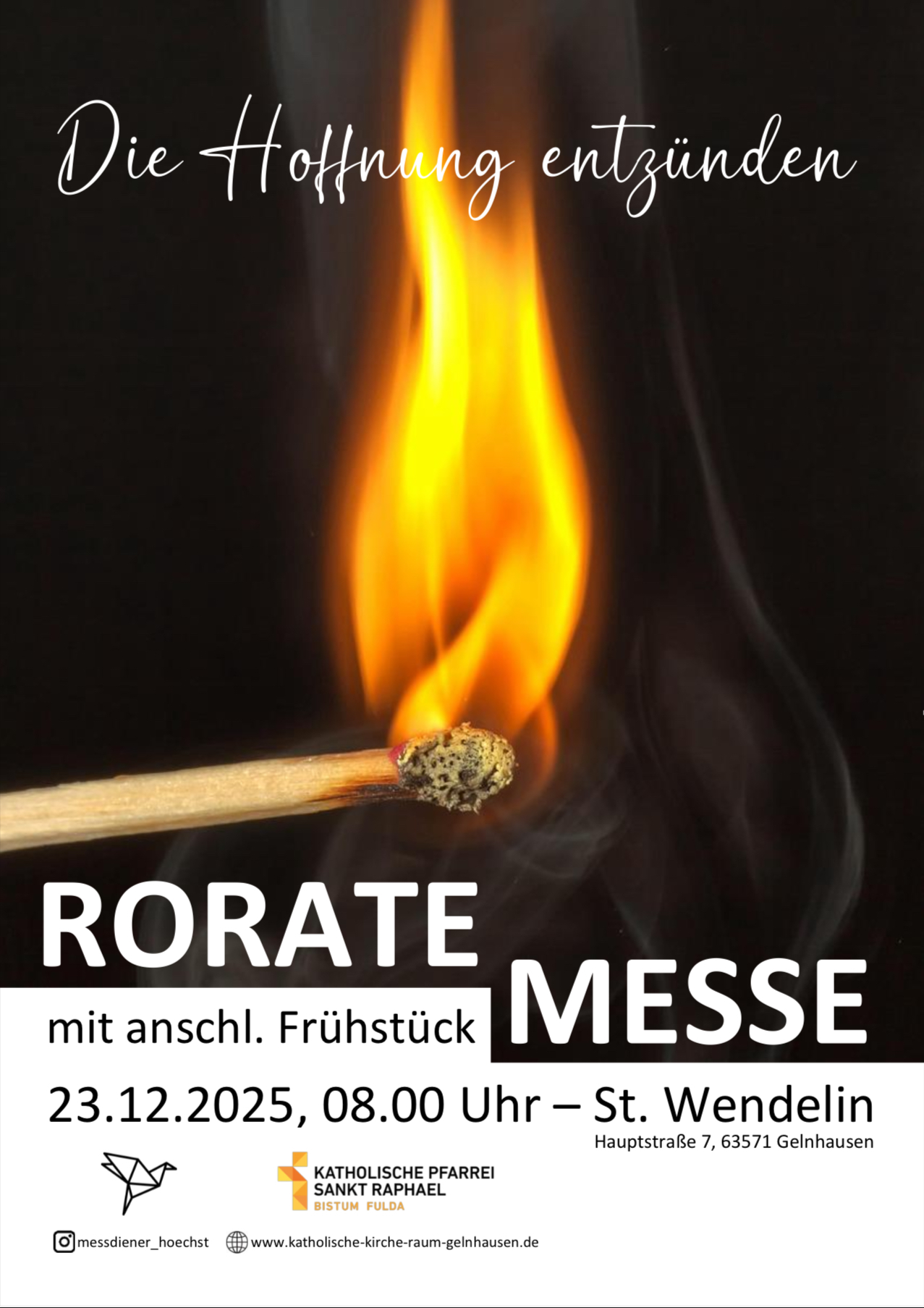 Die Youth Work Höchst lädt herzlich ein zur Roratemesse am Dienstag, den 23. Dezember 2025 um 08.00 Uhr in der Kirche St. Wendelin, Höchst. Unter dem Motto „Die Hoffnung entzünden“ feiern wir kurz vor Weihnachten einen besonderen Gottesdienst nur im Schein vieler Kerzen. Eingeladen sind besonders Kinder, Messdiener, Jugendliche und junge Erwachsene, aber natürlich auch alle anderen Mitglieder unserer Pfarrei St. Raphael, Gelnhausen. Im Anschluss an die Messe laden wir zum gemütlichen Beisammensein bei einem Frühstück ein. Kommt vorbei und entzündet mit uns die Hoffnung!